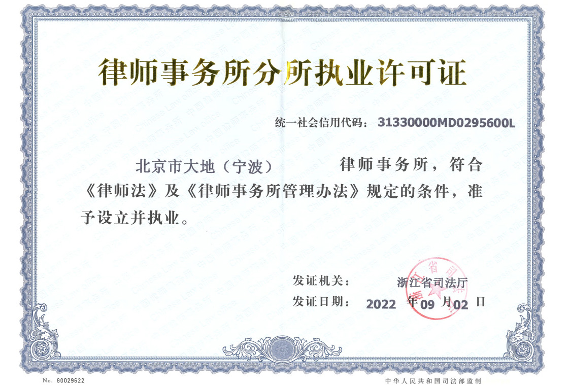 2022年9月2日,北京市大地(宁波)律师事务所获浙江省司法厅许可设立并执业。北京市大地(宁波)律师事务所是我所继青岛分所、上海分所成立后,在规模化、专业化、品牌化发展道路上的又一次重要跨越!